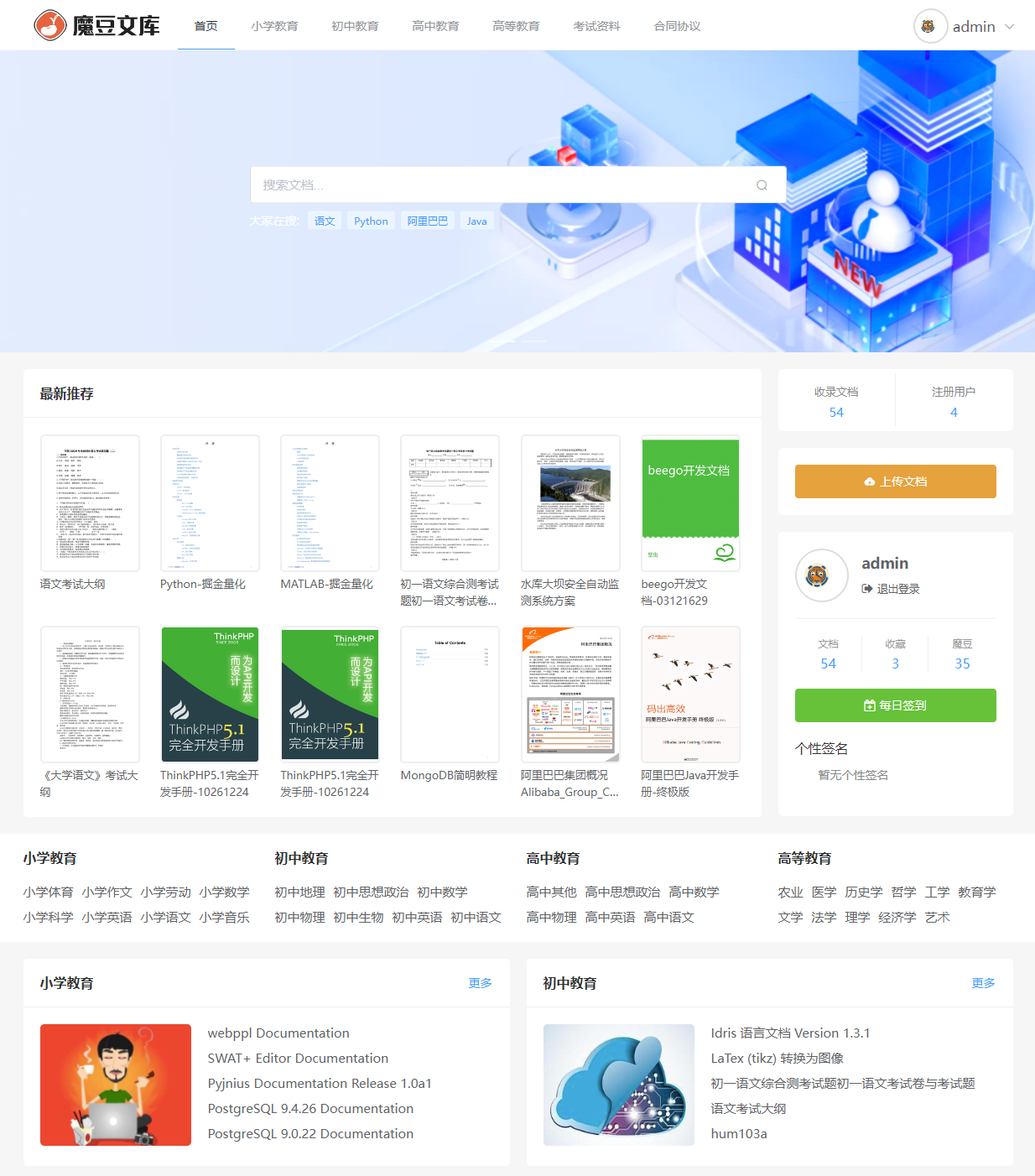 今天在开源中国网站浏览的时发现一个开源文库系统,还不错,推荐给大家。还系统是在dochub文库的基础之上进行重构的版本,目前名为魔豆文库,由 深圳某网络科技公司使用 Golang 开发的类似百度文库、新浪爱问文库的开源文库系统,支持 TXT、PDF、EPUB、MOBI、Office 等格式文档的在线预览与管理。